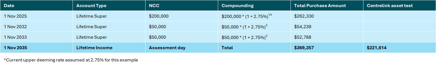 In the example below, if Amy makes 6% investment returns each year her account balance at 1 November 2035 would be $473,901, and in a standard account-based pension this full amount would count towards her Centrelink asset test. But, as outlined in the table, her MyNorth Lifetime Super account’s purchase amount at this time will be $369,357. Centrelink will then only assess 60% of this value from age 67 to age 84, and 30% thereafter – potentially unlocking substantial increases in age pension eligibility.