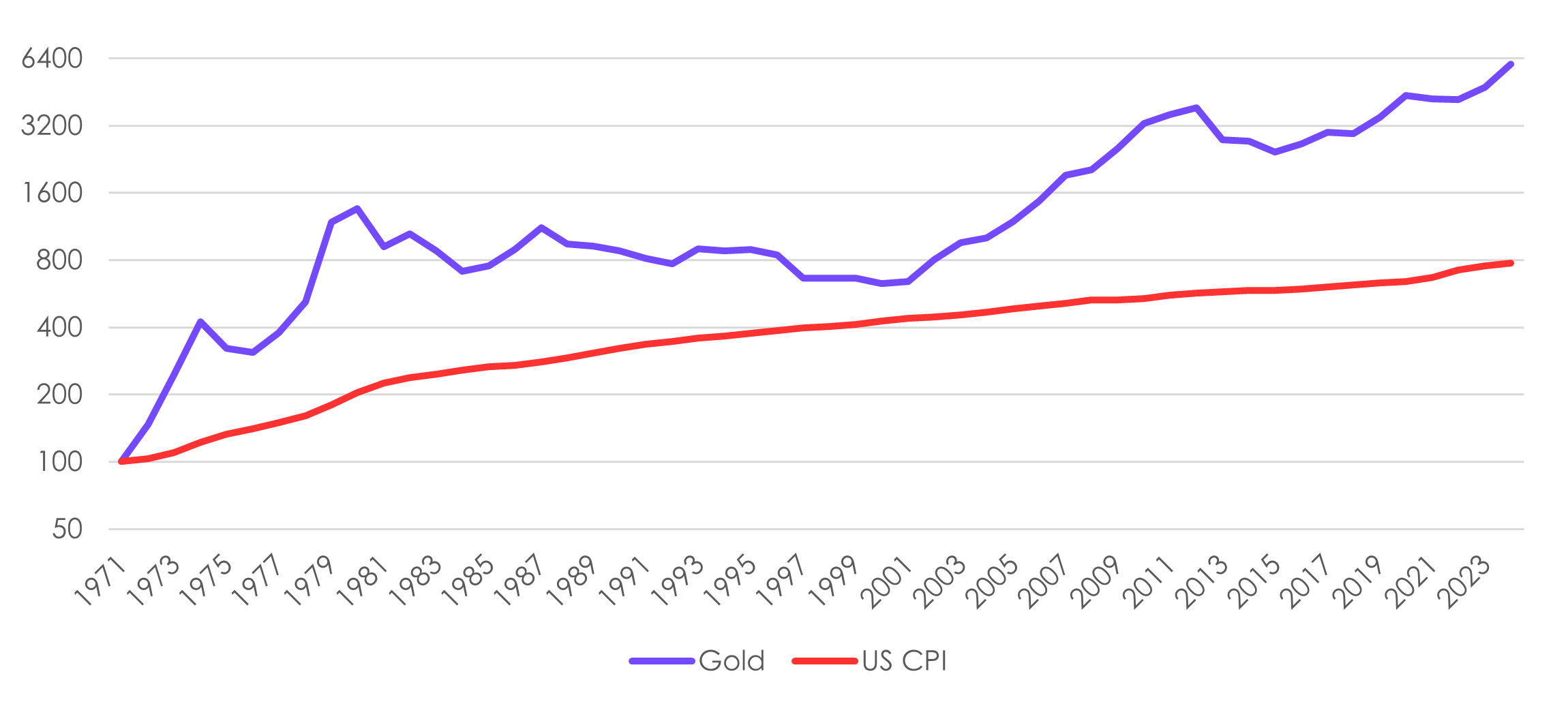 Gold returns versus CPI, indexed to 100 in 1971 (log scale)