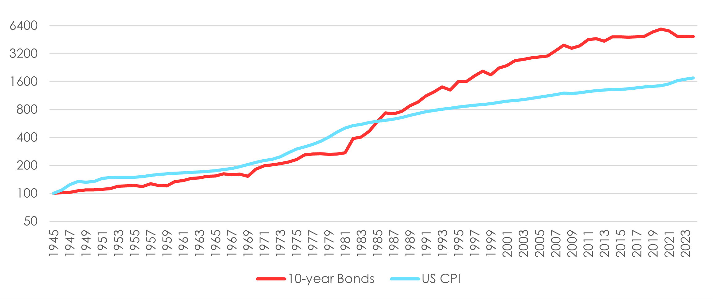 US 10-year Bond returns versus CPI, indexed to 100 in 1945 (log scale)