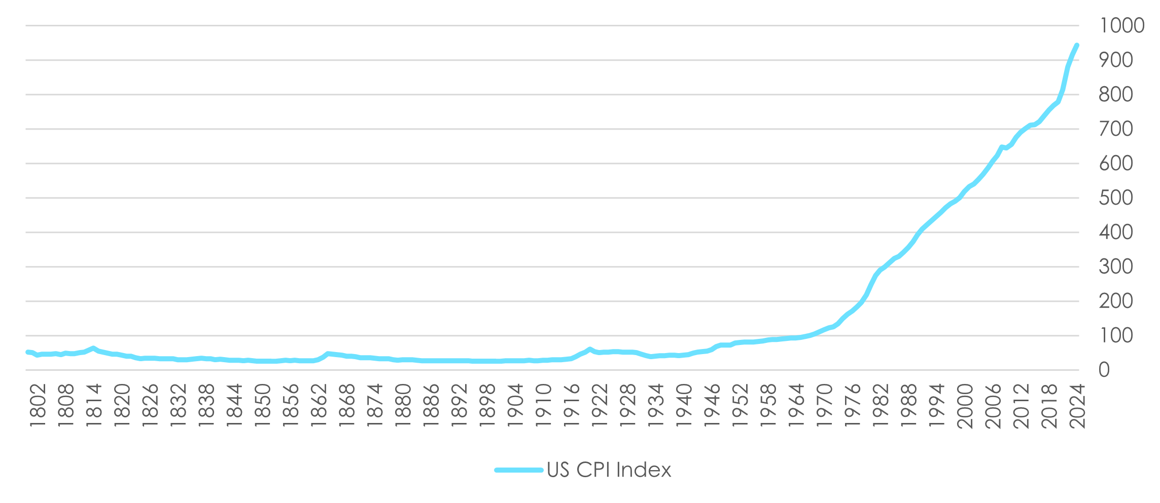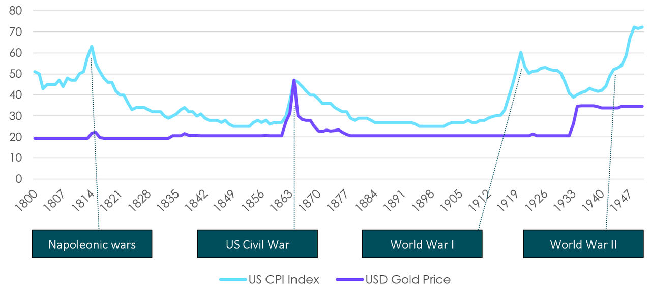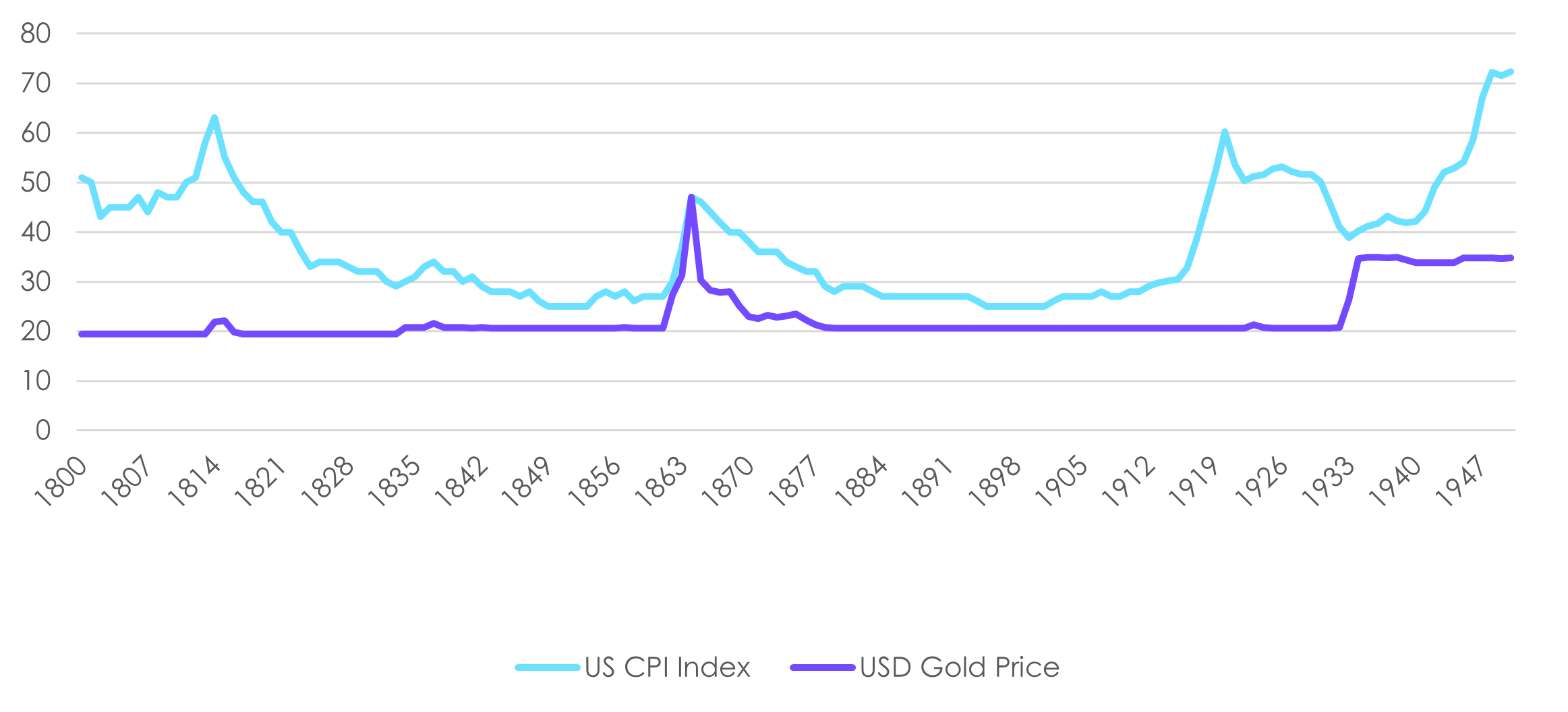 In antiquity, gold and silver typically served as currency, until governments eventually began to issue paper money backed by gold and/or silver, which was known as the ‘Gold Standard’. Governments specified a fixed conversion ratio between gold and their currency, and inflation remained relatively well behaved, with the price level generally only rising in response to war, as can be seen in the following chart.