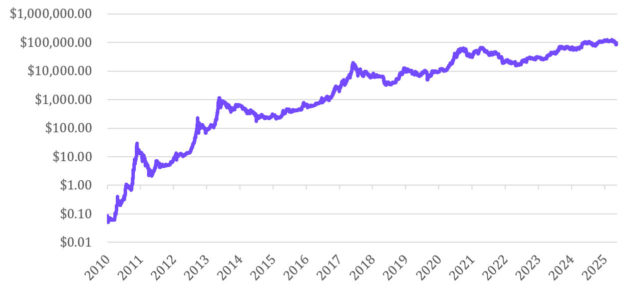 (iii) the importance of a long‑horizon lens - short‑term drawdowns can be severe even within a longer upward adoption trend. A log view helps avoid recency bias from the latest cycle dominating the entire chart on a linear axis.
