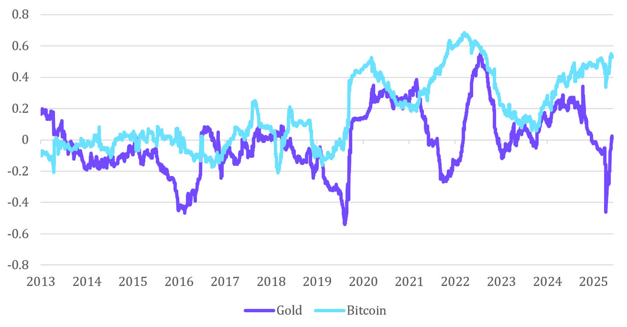 Rolling 6-month correlation between the Nasdaq and both Bitcoin and gold