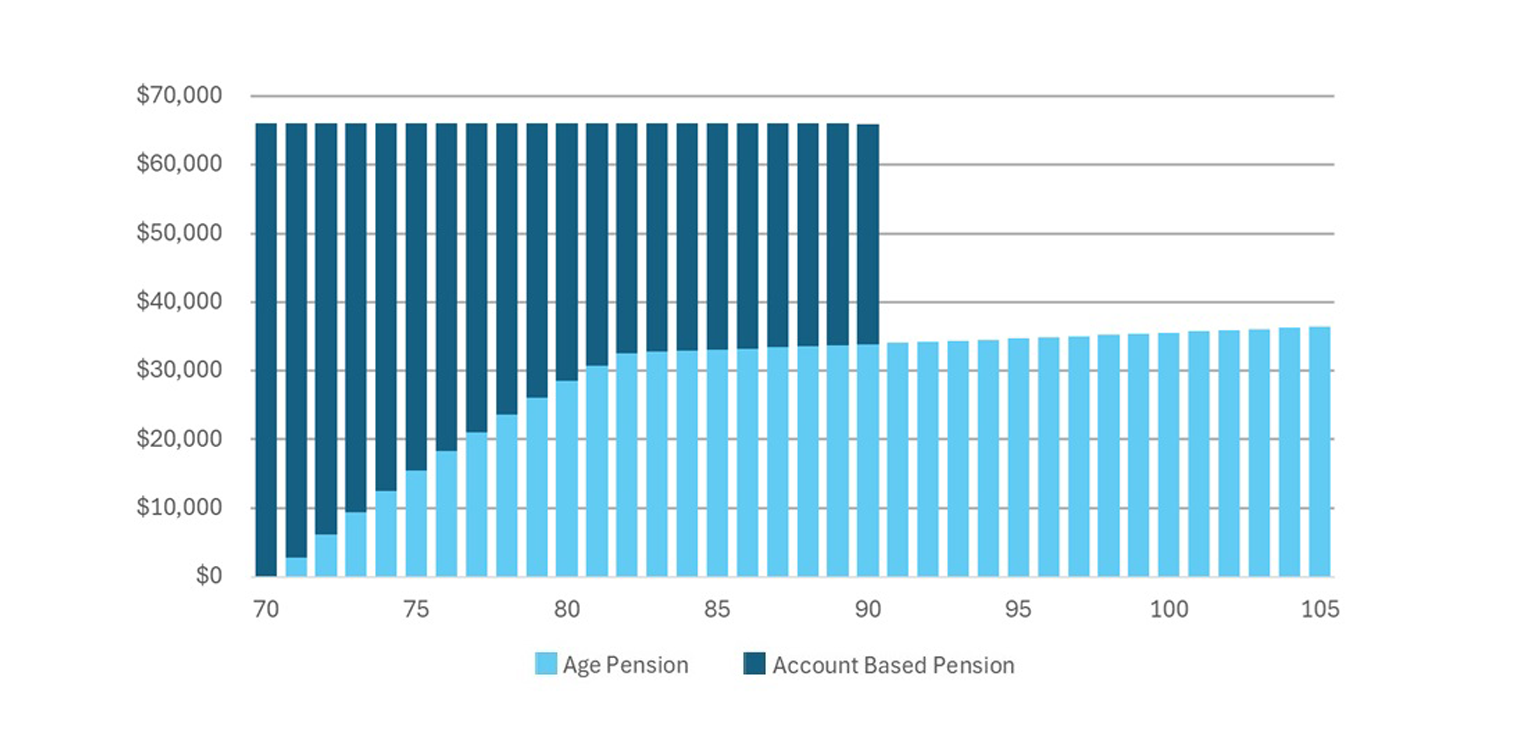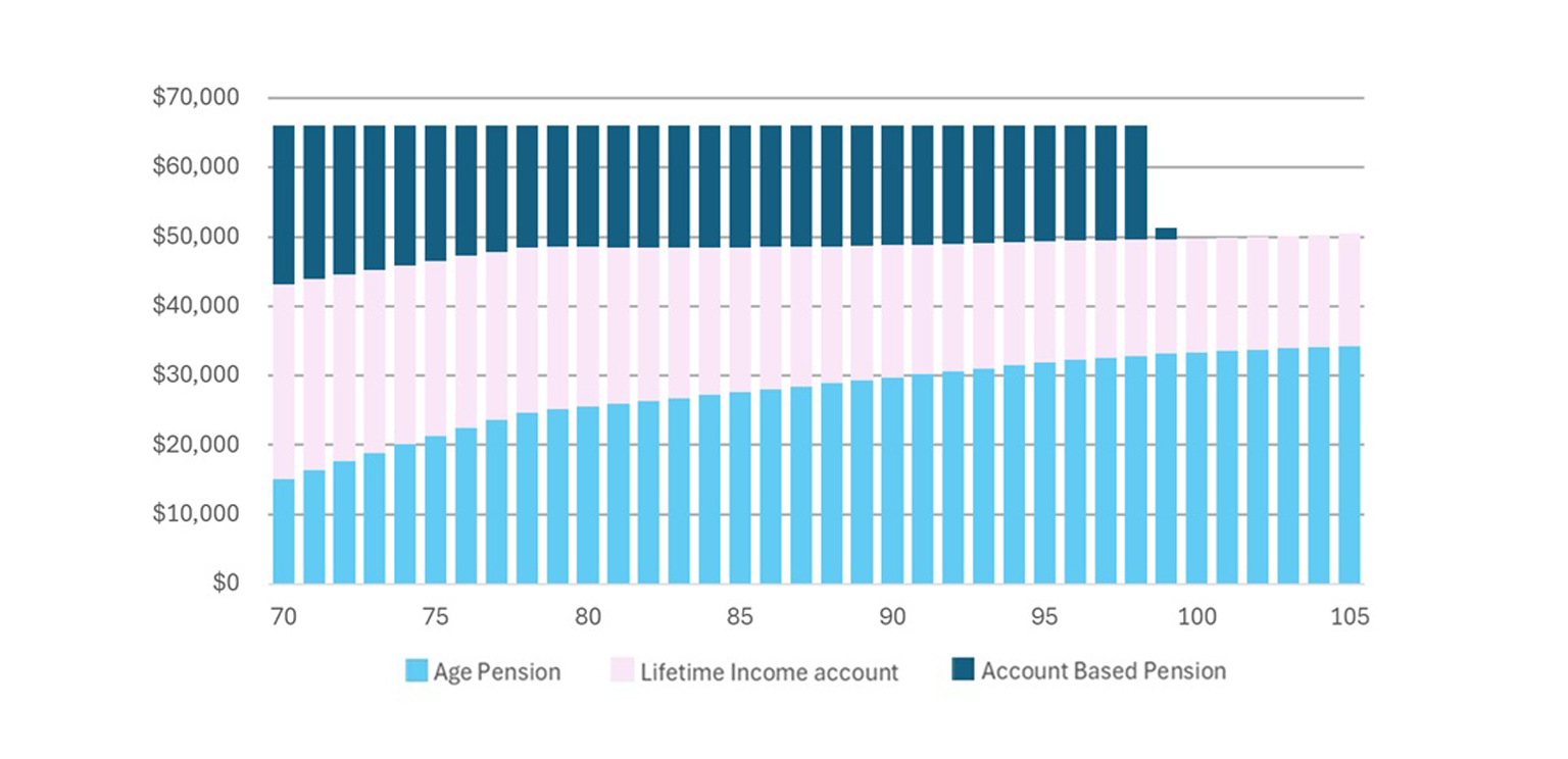 Jinoo retires at age 70, is a homeowner with an additional $100,000 in other assets. He wants to receive $66,000 income in today’s dollar’s indexed to CPI. He rolls his Deferred Lifetime Income account into a Lifetime Income account and rolls his standard super into an Account Based Pension.